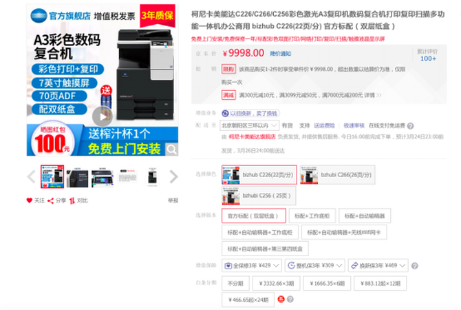 柯尼卡美能达 bizhub C226复合机 京东热销价9798元 【购买链接】