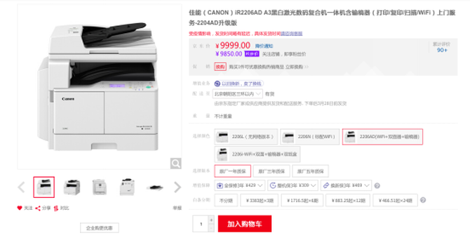 佳能2206AD复合机 京东热销价9999元 【购买链接】