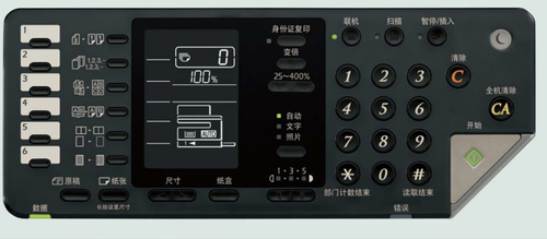 配置了宽大、清晰的液晶显示屏,按键布局合理,一目了然,让使用者轻松实现机器配置和功能操作。控制面板还可以设置常用的快捷操作按键。并且两个LED指示灯,可通过其颜色的变化来显示打印机不同的工作的状态。