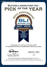 BLI(Buyers Laboratory Inc)公布了其2011年上半年“年度之选”奖。理光商务多功能彩色数码复合机——Aficio MP C7501sp凭借其为客户提供的物超所值的解决方案,在众多参赛机型中脱颖而出,最终荣膺BLI 2011 年上半年的“年度之选”奖,获奖类别为“杰出的70-80ppm A3彩色多功能打印复合机。