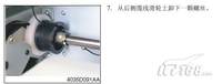 美能达复合机DI1611 2011扫描器传动缆线的拆卸步骤:7. 从后侧缆线滑轮上卸下一颗螺丝。8. 从滑轮前侧取下C 形环。