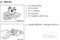 美能达复合机DI2510 3510 3010透镜的清洁步骤:1. 拆下原稿扫描玻璃。2. 拆下前支撑架。3. 拆下2 个紧固板。4. 拆下稿台玻璃。5. 拆下6 颗螺丝与CCD 单元盖。6. 使用蘸有酒精的软布,擦拭透镜以清除污垢。