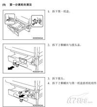 美能达复合机DI2510 3510 3010第一分离轮的清洁步骤:1. 拆下第一纸盒。2. 拆下2 颗螺丝与接头盖。3. 拆下接头。4. 拆下2 颗螺丝与第一纸盒搓纸轮组件。