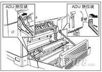(1) 打开旁路供纸托盘。(2) 打开ADU 盖板。(3) 打开转印单元,并释放位于前部的ADU 限位块。(4) 拧下1 个螺丝,并取下位于后部的ADU 限位块...